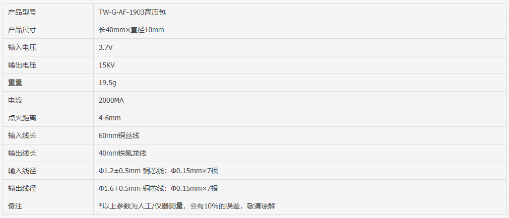 我们高压包常规输入有3.7VDC,4.8VDC,7.2VDC/AC,12VDC/AC,如需其他参数,可联系客服打样定制。