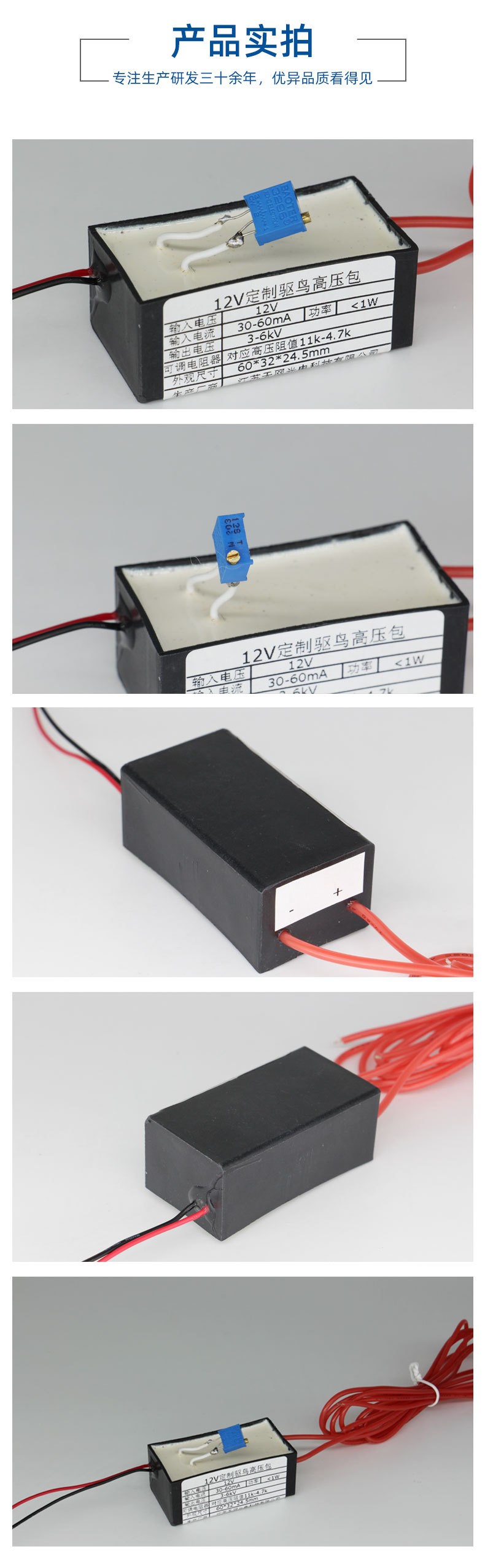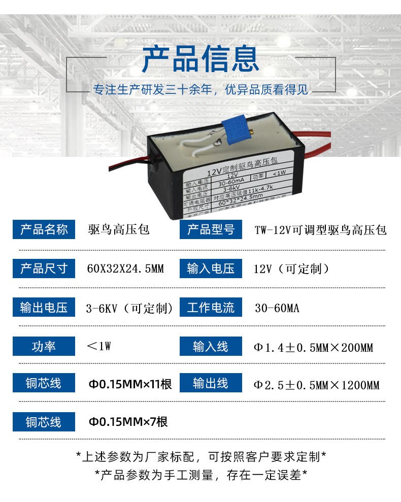 这款电力驱鸟器高压包接上电源就可以工作,白天工作12个小时,晚上关闭,用于高压铁塔上驱鸟。高压输出地线接铁塔,高压线接鸟会站立的地方。驱鸟器高压包可以连续工作数个小时。输入线为红黑细线(红正黑负)可调电阻为0-20K量程。